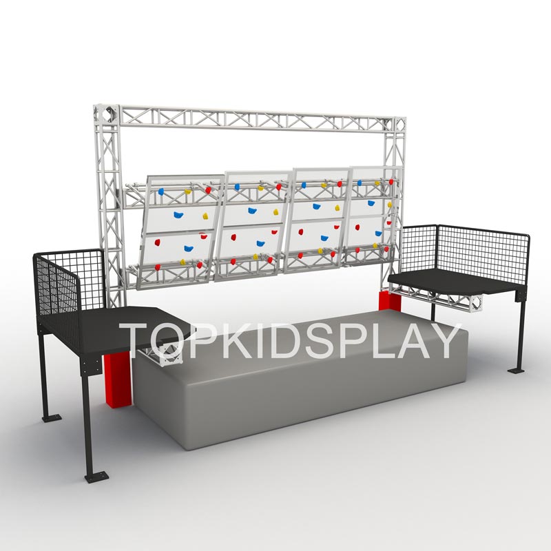 Participants must climb horizontally across multiple climbing walls, navigating the different angles and/or color coded paths (depending on configuration). This component requires upper body strength, increased flexibility and bouldering experience.